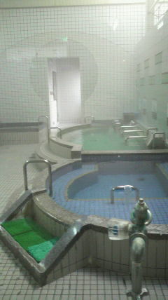 設備はすきっと簡単な構造。通常のお湯に2種(縦・横)のジェット、奥に酵素風呂に2つのジェット、電気風呂に水風呂、サウナ。
